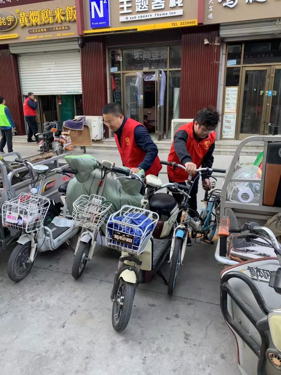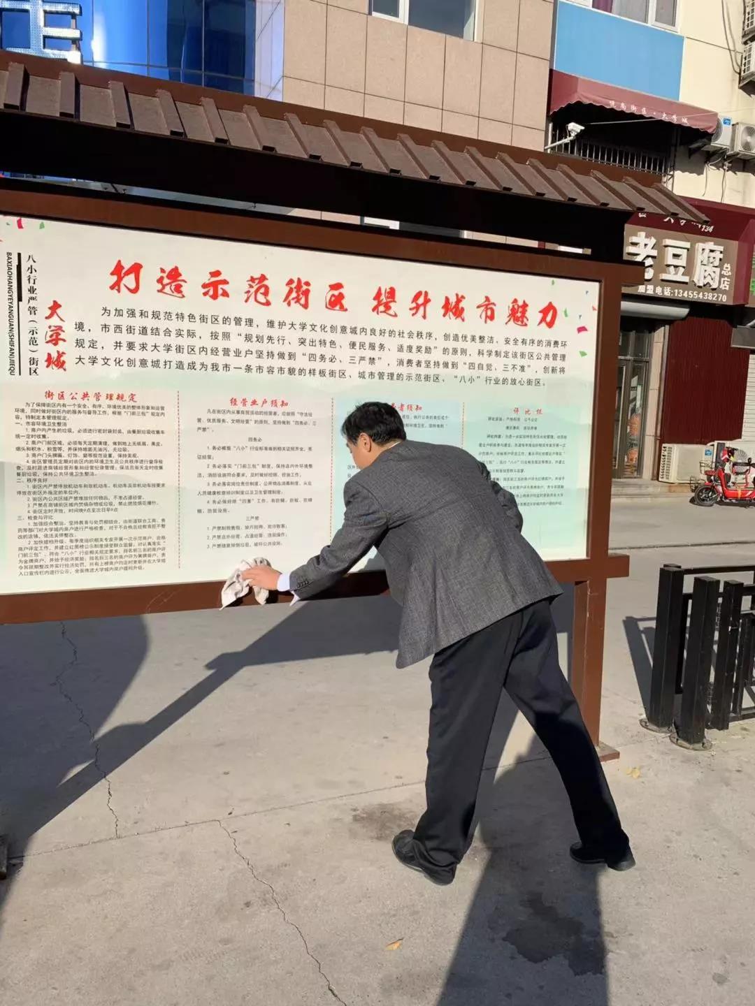 上8点,大家便分头行动,有的同志负责清理垃圾,利用垃圾夹、扫帚等工具将路边散落的塑料袋、落叶、烟头等清理干净;有的同志负责擦拭广告牌、宣传栏;有的同志则负责将店铺门口、街道两旁的共享单车以及各店铺的私人单车摆放在专用停车位上。经过一个多小时的“战斗”,文化城面貌便焕然一新,经过细心清理后的路面显得更加干净宽敞,经过擦拭之后广告牌看上去更加干净、明亮,经过摆放后的电动车自行车看上去更加整齐。