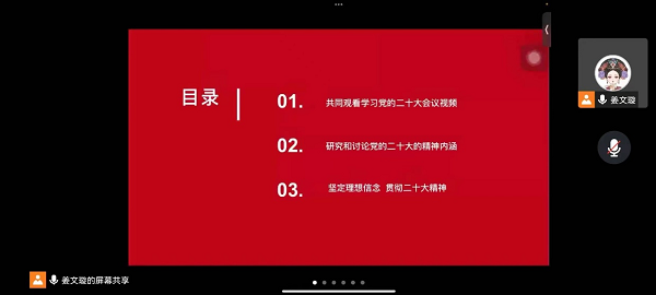 20安检专四团支部成员虽然因为实习、升学等情况无法线下组织,但是在团支部书记的带领下通过腾讯会议共同观看回顾党的二十大相关视频,结合网络上相关文字材料及会议内容分析大纲共同研究讨论了关于党的二十大精神的精神内涵,学习完成后同学们互相分享个人感悟,并结合实际主动提出个人在日后学习生活方面的落实方式,现阶段有利于明确专升本目标、增强专升本毅力。