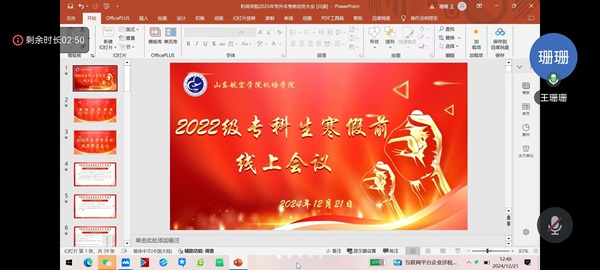 为了帮助学生深入了解专升本相关政策,明晰毕业流程与注意事项,BB贝博艾弗森官方网站于2024 年 12 月 21 日召开专升本政策宣讲及毕业前后工作提醒线上会议,此次会议由2022级辅导员王珊珊主讲,2022级安检专业全体学生参加。