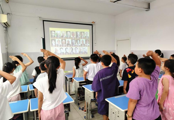 当屏幕展现23位“两弹一星”功勋科学家群像,宣讲团成员带领同学们肃然敬礼。这一刻,手臂高举化作精神对话的桥梁,于敏、邓稼先等先辈“九死不悔”的信念在少年眼中激荡。他们懂得,英雄是燃烧家国情怀的鲜活生命。宣讲尾声,宣讲团成员寄语:“‘两弹一星’精神是‘精神核弹’,愿你们以知识为火种,奋斗点燃,让它在新时代绽放光芒。”